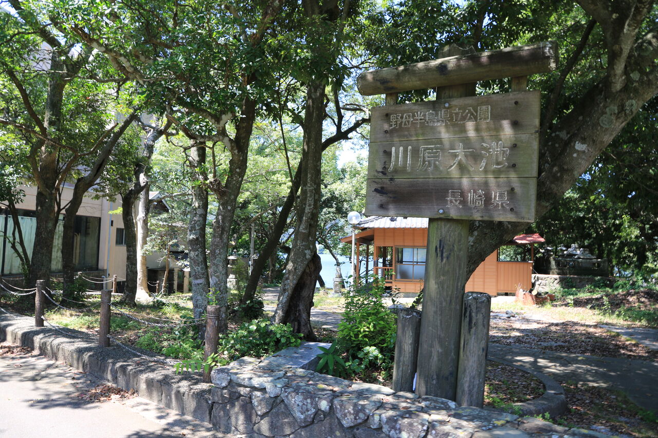 長崎バス、大波止より60分 松林の中に、大蛇の伝説で有名な川原池と海水浴場に分れ、特に海辺の蛇紋石が美しい。7月上旬から9月上旬まで。