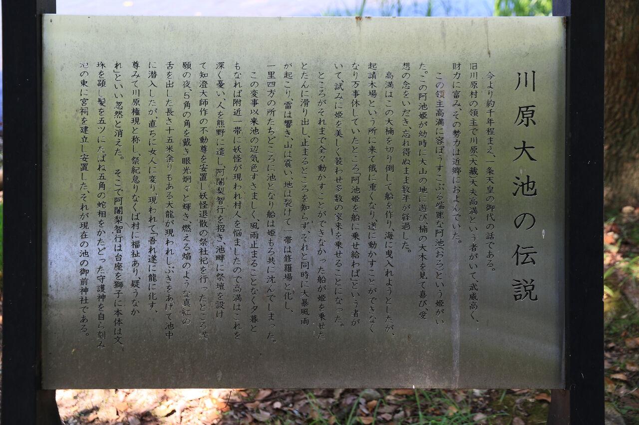 由緒は当地の領主・河原大蔵太夫高満が正暦5年(994年)11月に愛娘阿池(おち)姫の冥福を祈念するために建立したという伝説があります。