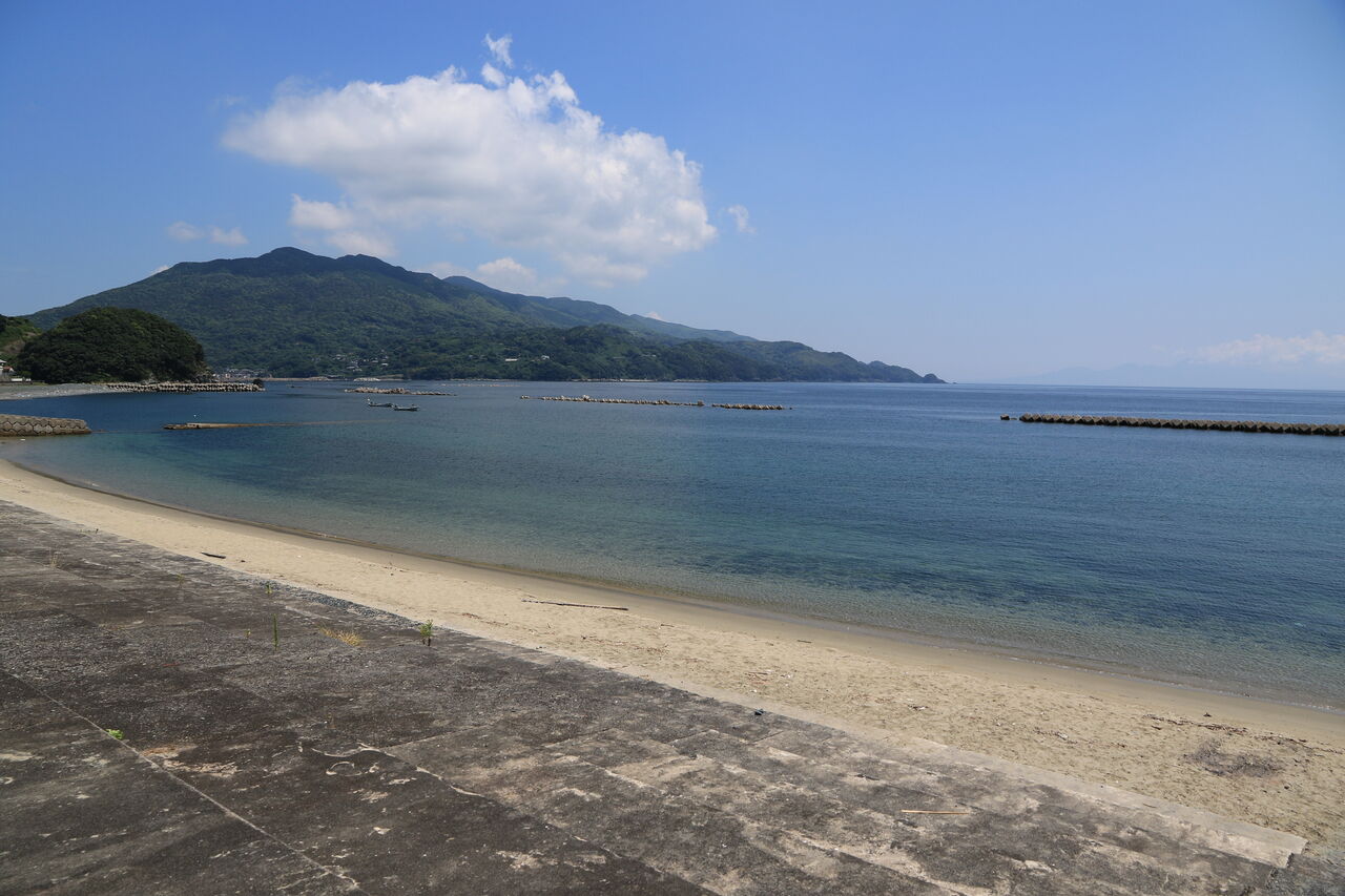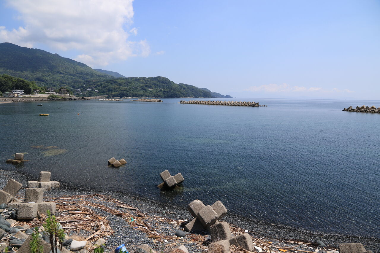 下の写真は前回記事の本村海岸、クリックして拡大すると丸い石が堆積していることが分かります。