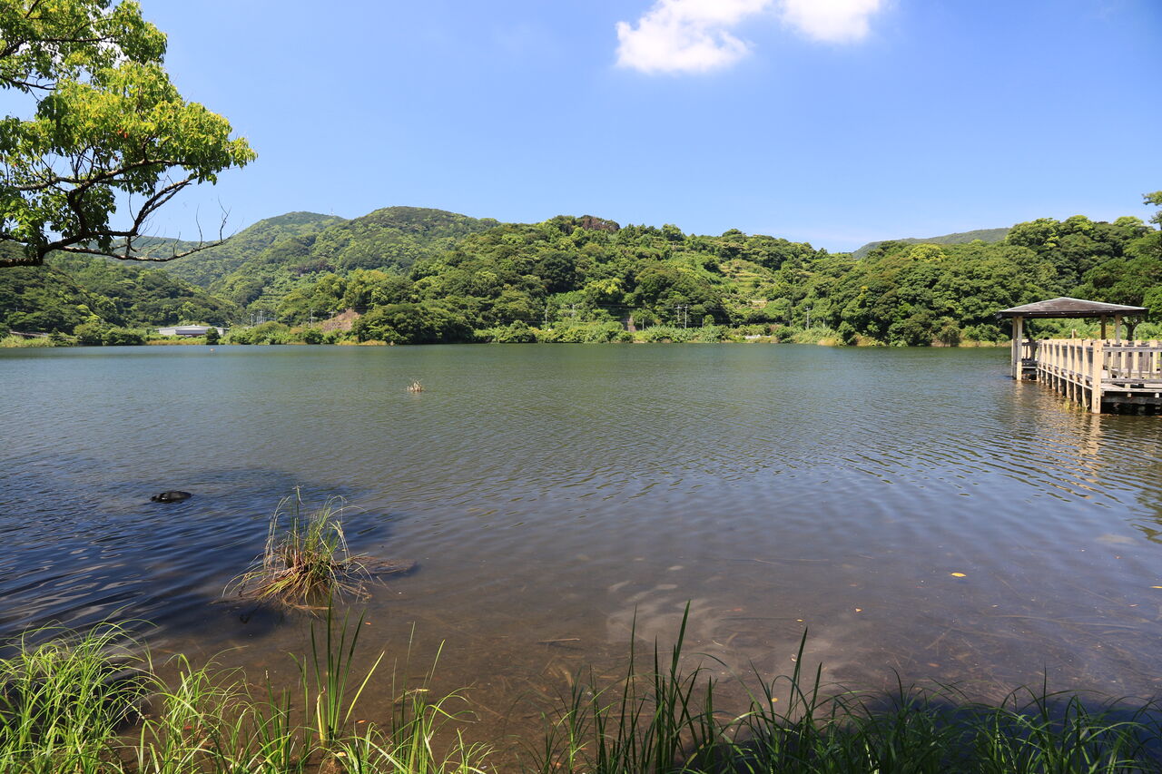 川原大池は広さ約13ha、周囲約1.9km、最大水深約9mの県内最大の天然湖。