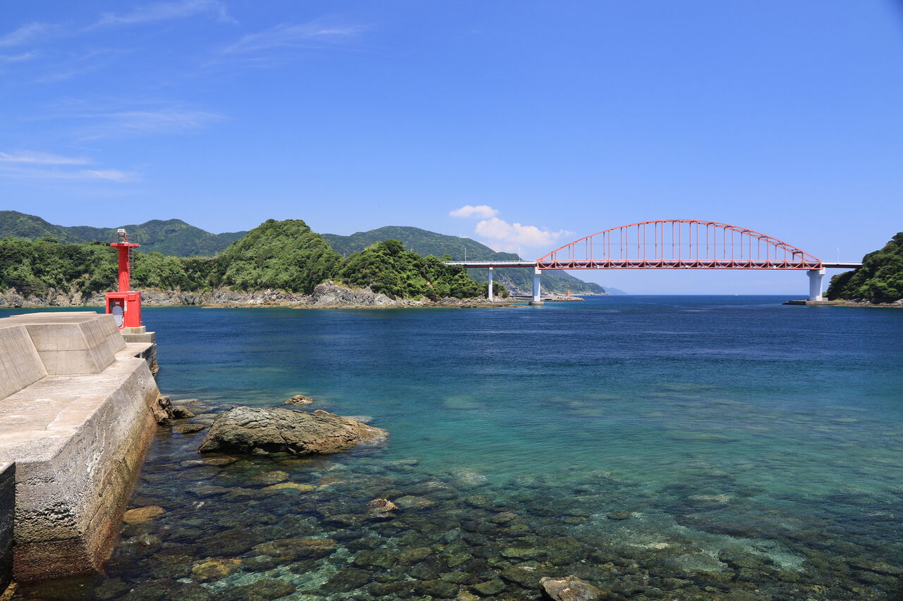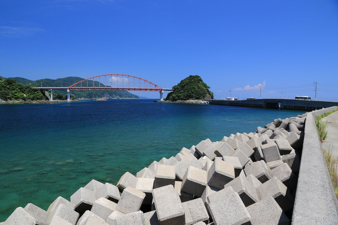 樺島に渡ってある「樺島港外防波堤灯台(通称・赤灯台)」と樺島大橋。