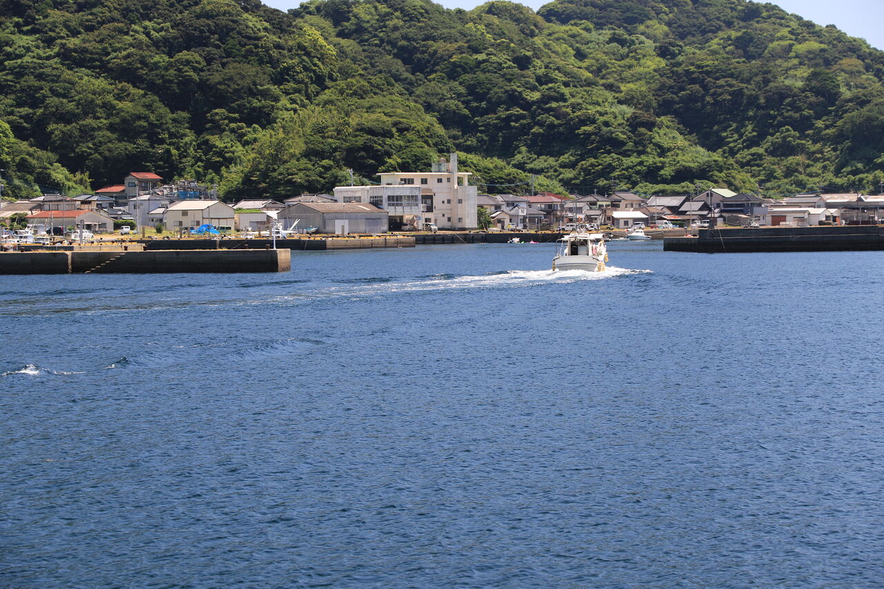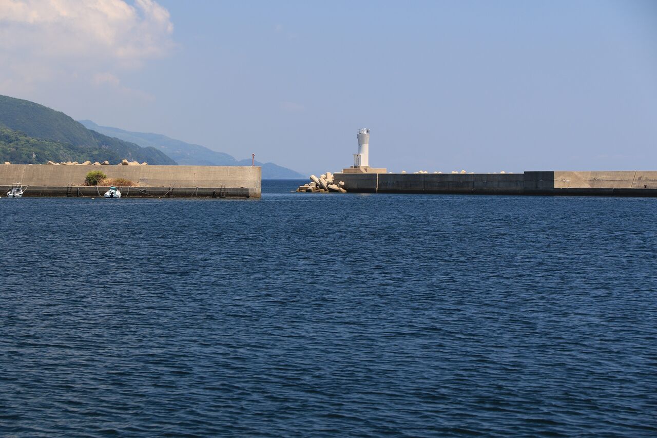 深い入り江の樺島港に入る目印は白い「樺島港東防波堤灯台」です。