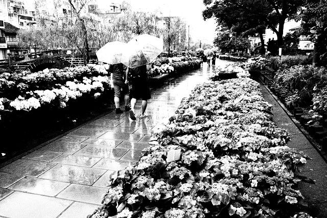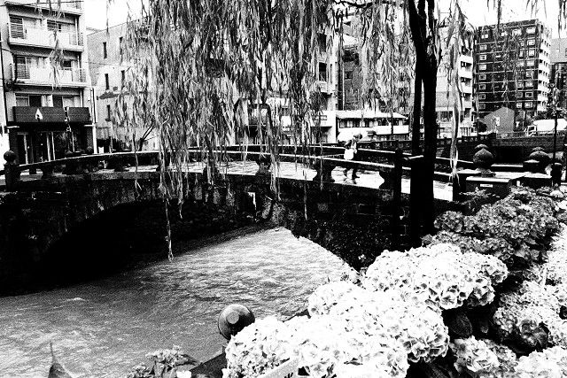 中島川は泥水が轟々と流れ、紫陽花の色や川の風情も台無しなのでモノクロで撮りました。