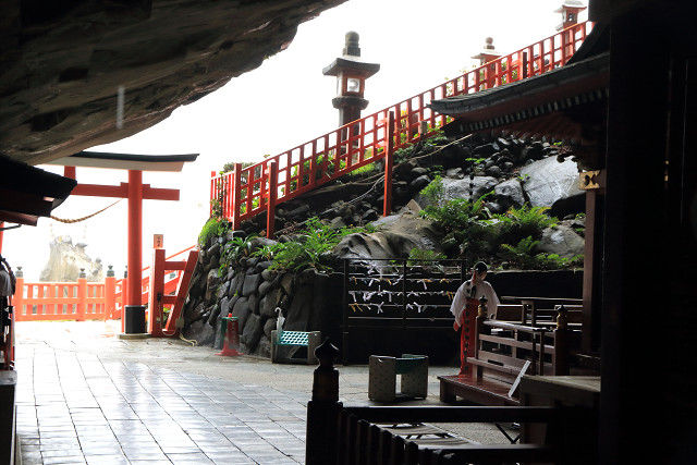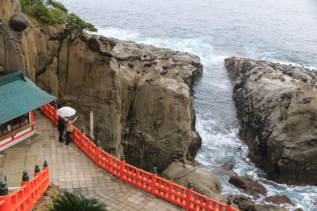 岩窟の中に朱塗りの本殿がある「鵜戸神宮」。