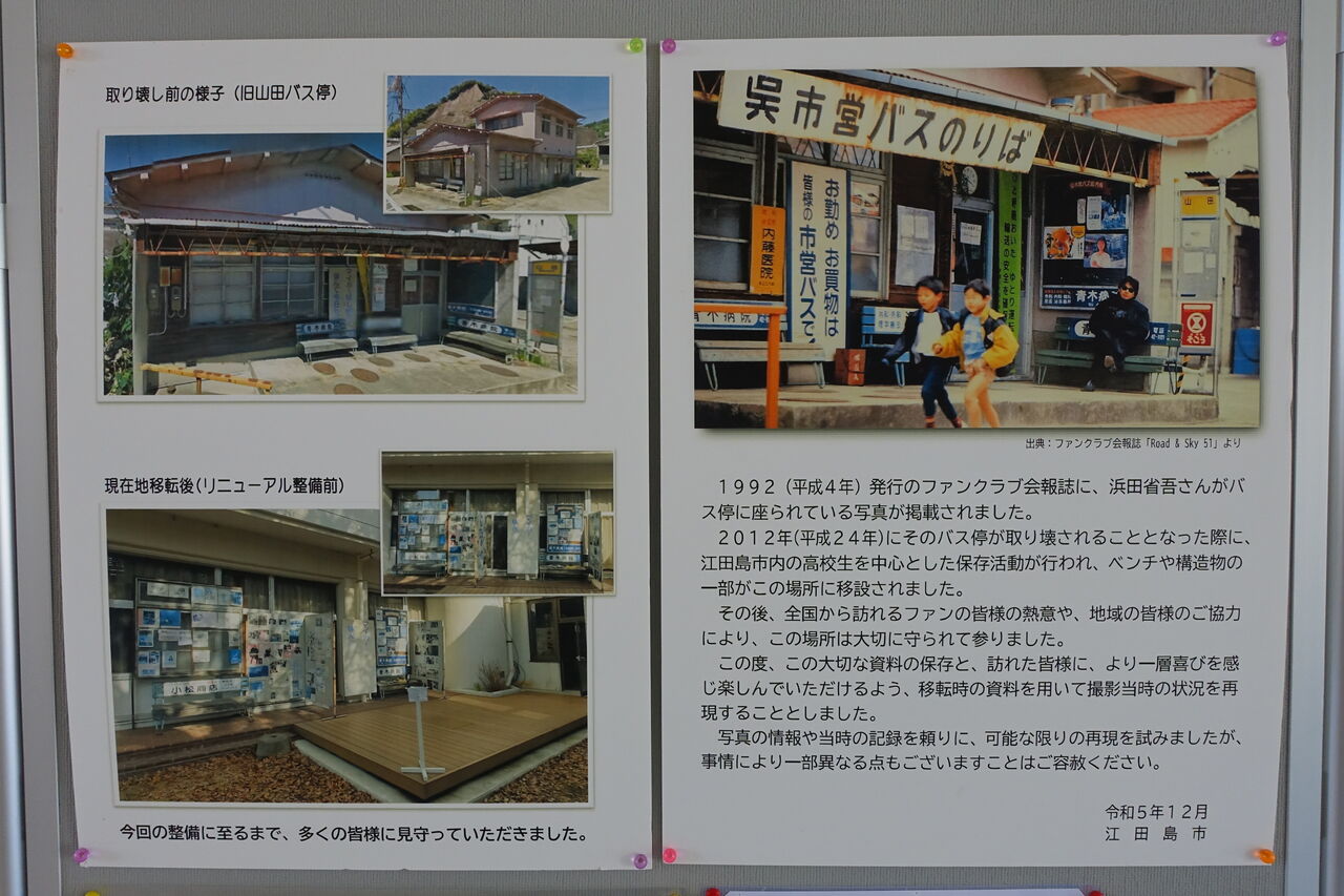この写真を契機とし、廃止予定のバス停が江田島市立図書館の敷地内に保存・再現され、今は多くのファンが訪れる場所、いわゆる聖地巡礼の場所となっています。